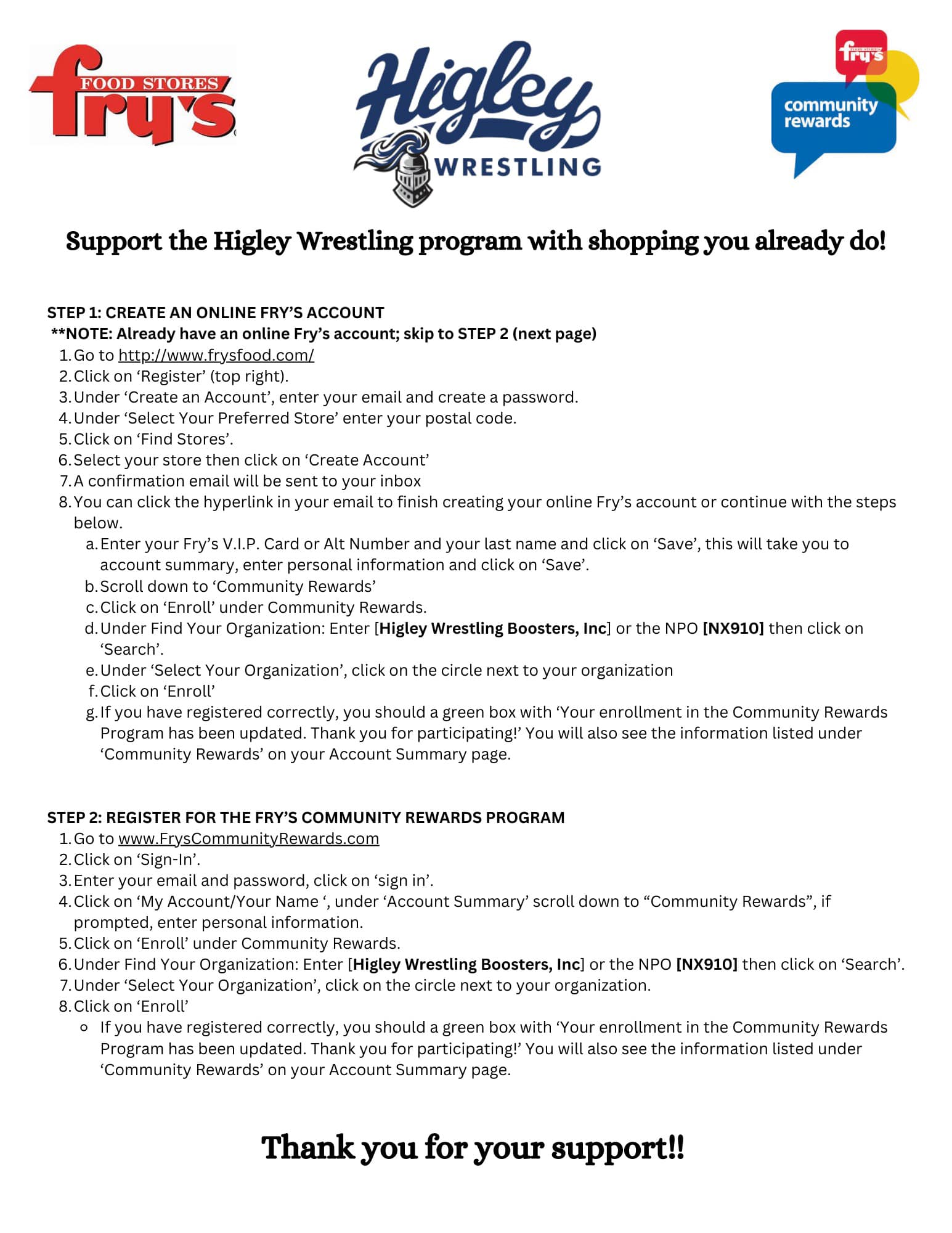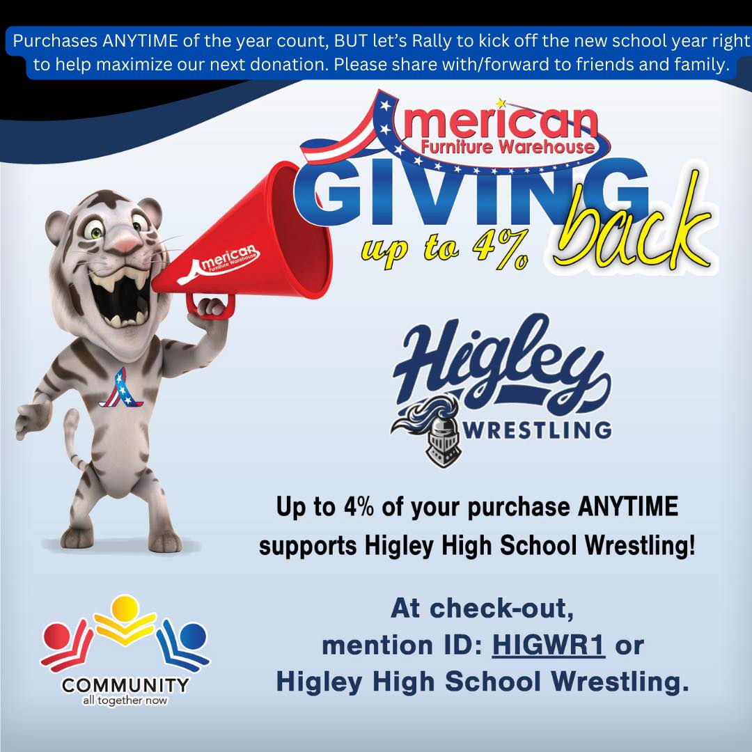There are two easy ways to support your Higley Knights wrestlers with Fry's Food Stores and American Furniture Warehouse. Both of these great local businesses are giving back to our program every time you shop at their locations. The money generated goes to help with travel, equipment, snacks, and meals. You must sign-up with Fry's and mention Higley Wrestling when checking out at American Furniture Warehouse.